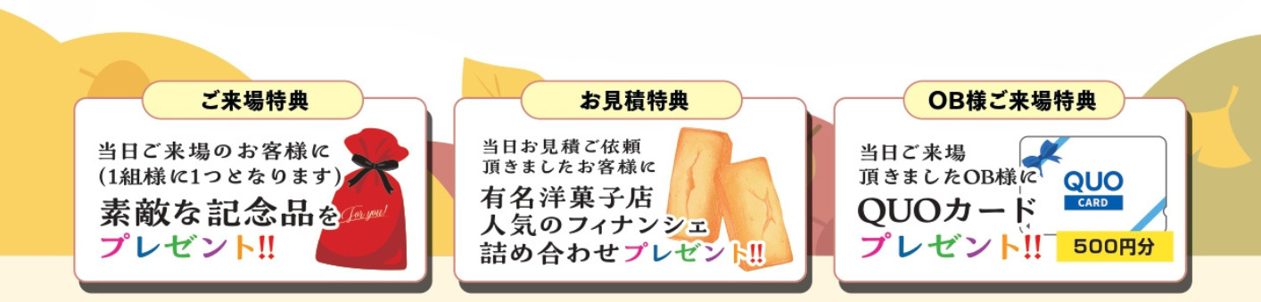 その他、お見積り特典や当日ご来場して頂いた方にも記念品をプレゼントいたします!